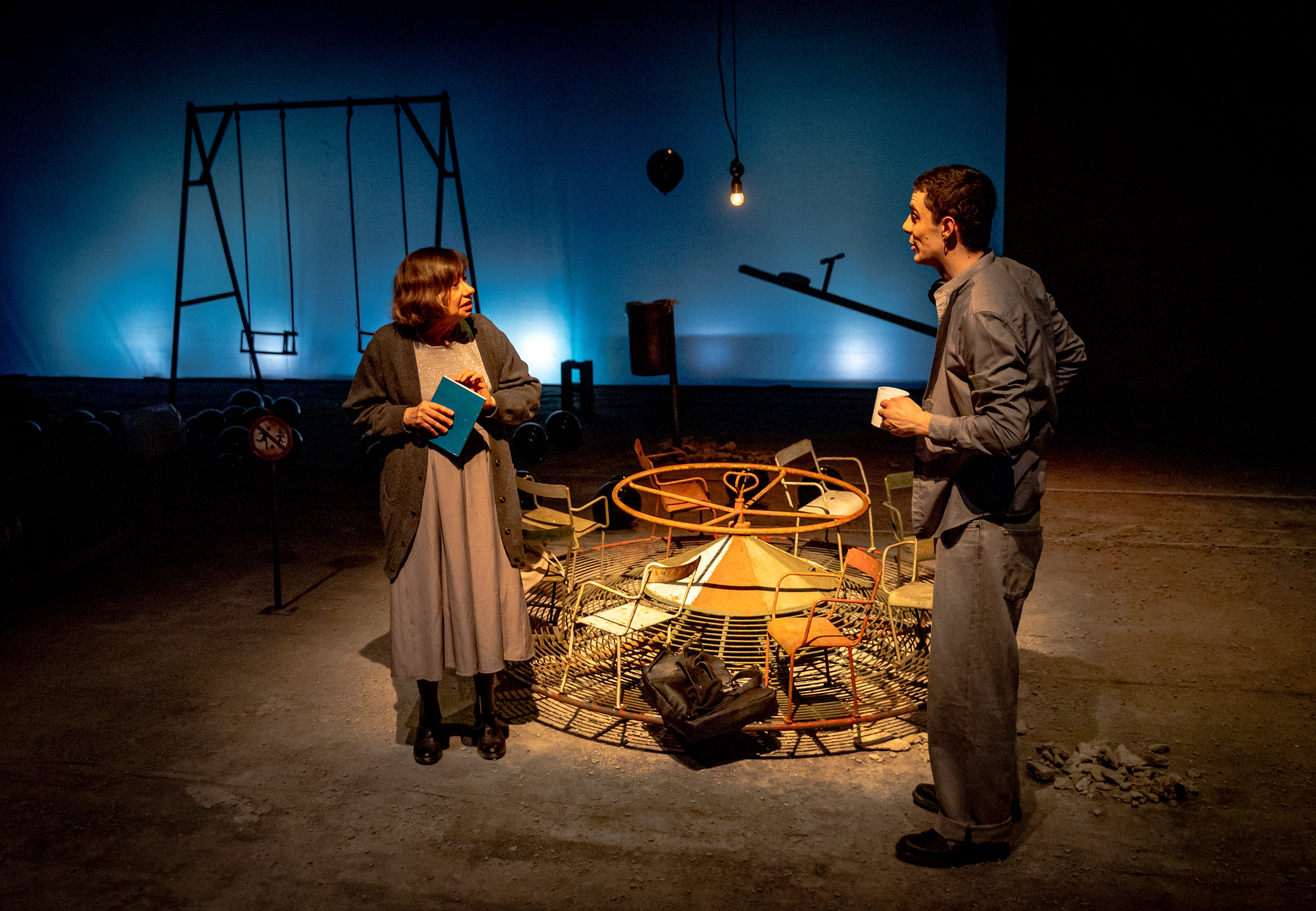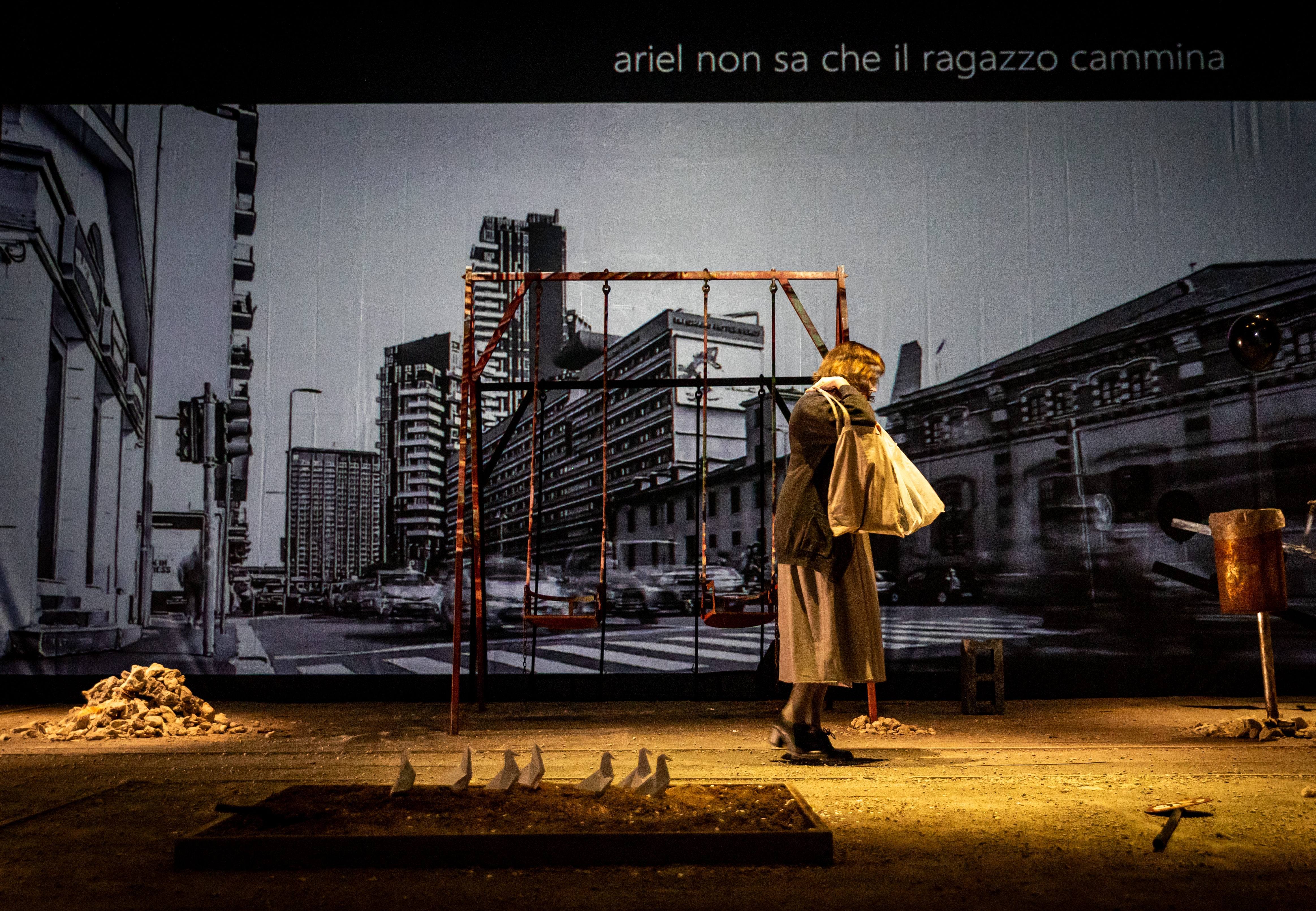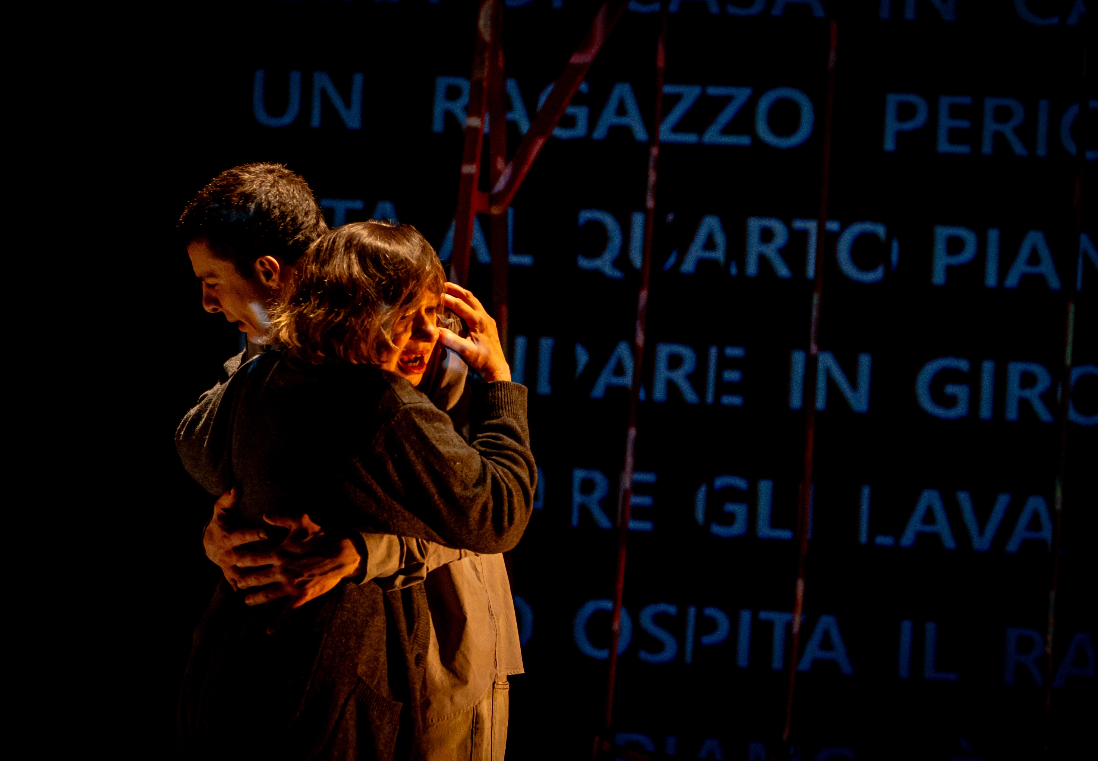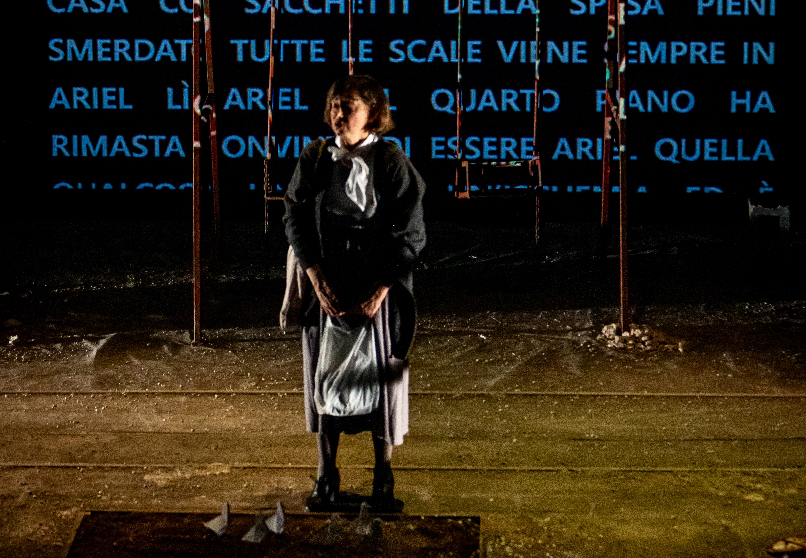 Uno spettacolo interessante perché mette in campo la creatività delle nuove generazioni: Francesco Toscani, l’autore classe 1996, e Andrea Piazza, il 29enne e bravo regista. Lo spazio del teatro diventa uno spiazzo di cemento e ghiaia, qua e là giochi per bambini in disuso, come una di quelle aree abbandonate delle grandi città di oggi. C’è molta solitudine. Efficace la regia anche nel governo della recitazione dei due attori, Monica Bonomi e Fabrizio Calfapietra. Da applauso.